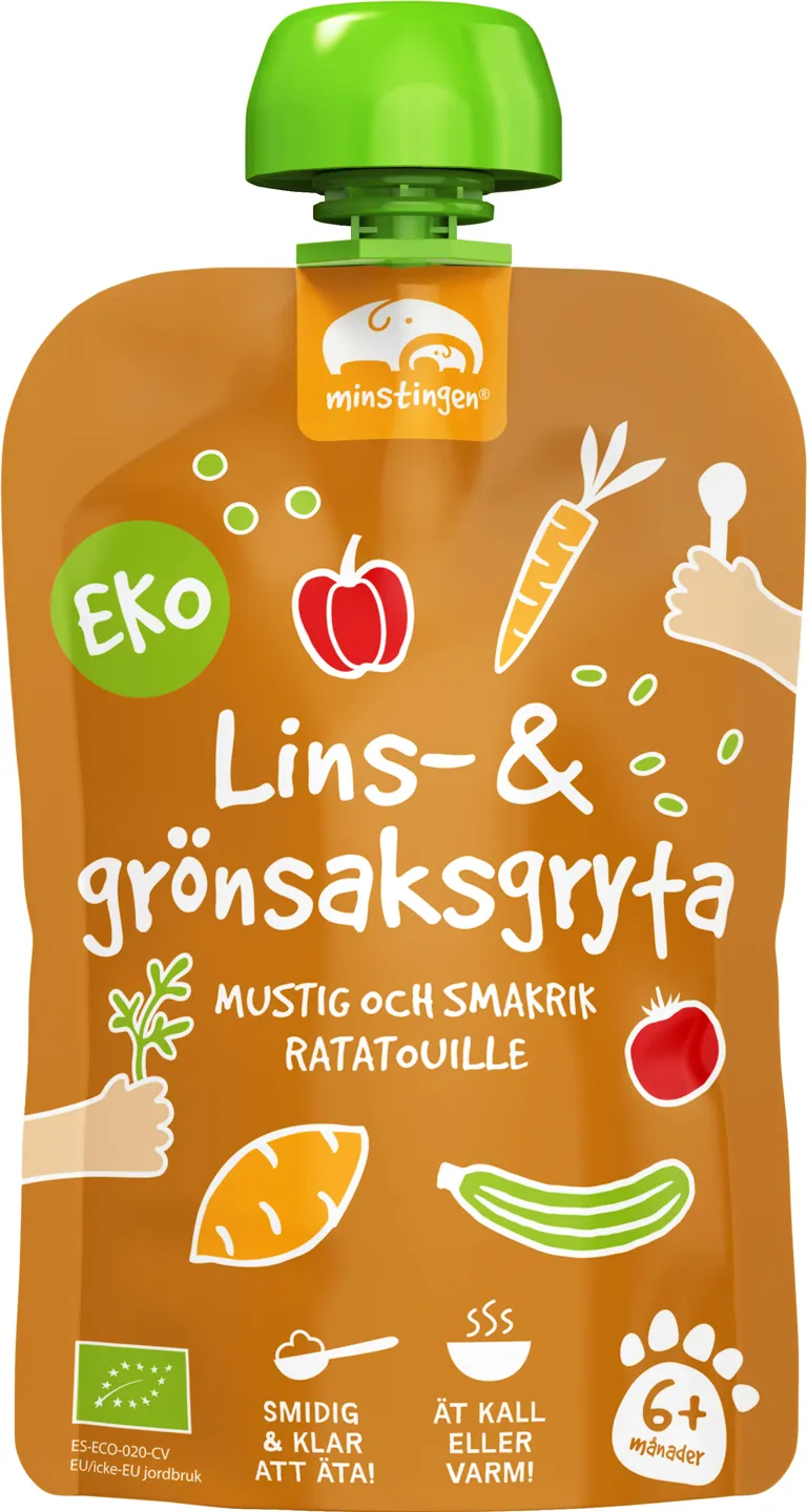Ekologisk puré av lins- och grönsaksgryta. Vår barnmat i klämpåse är anpassad för barn över 6 månader. Servera rumstempererad eller värm i vattenbad eller i en skål i mikrovågsugn. Perfekt när din vilding behöver energi. Förvaras i rumstemperatur. Öppnad förpackning förvaras i kylskåp +8°C, håller i högst ett dygn.