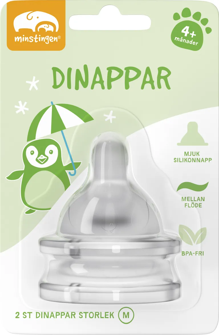 Mjuka dinappar för barn över 4 månader. Dinapparna ger ett mellanflöde och passar till alla våra nappflaskor. 2-pack. Material: BPA-fria dinappar i mjuk silikon.